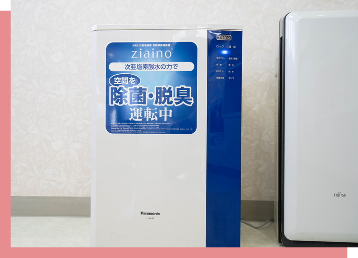 待合室に空気清浄機を完備しております。この空気清浄機は、高濃度「プラズマクラスター」技術を搭載しており、浮遊ウイルスや梅雨時から夏にかけて繁殖しやすい浮遊カビ菌などを抑えて空気の汚れを浄化します。